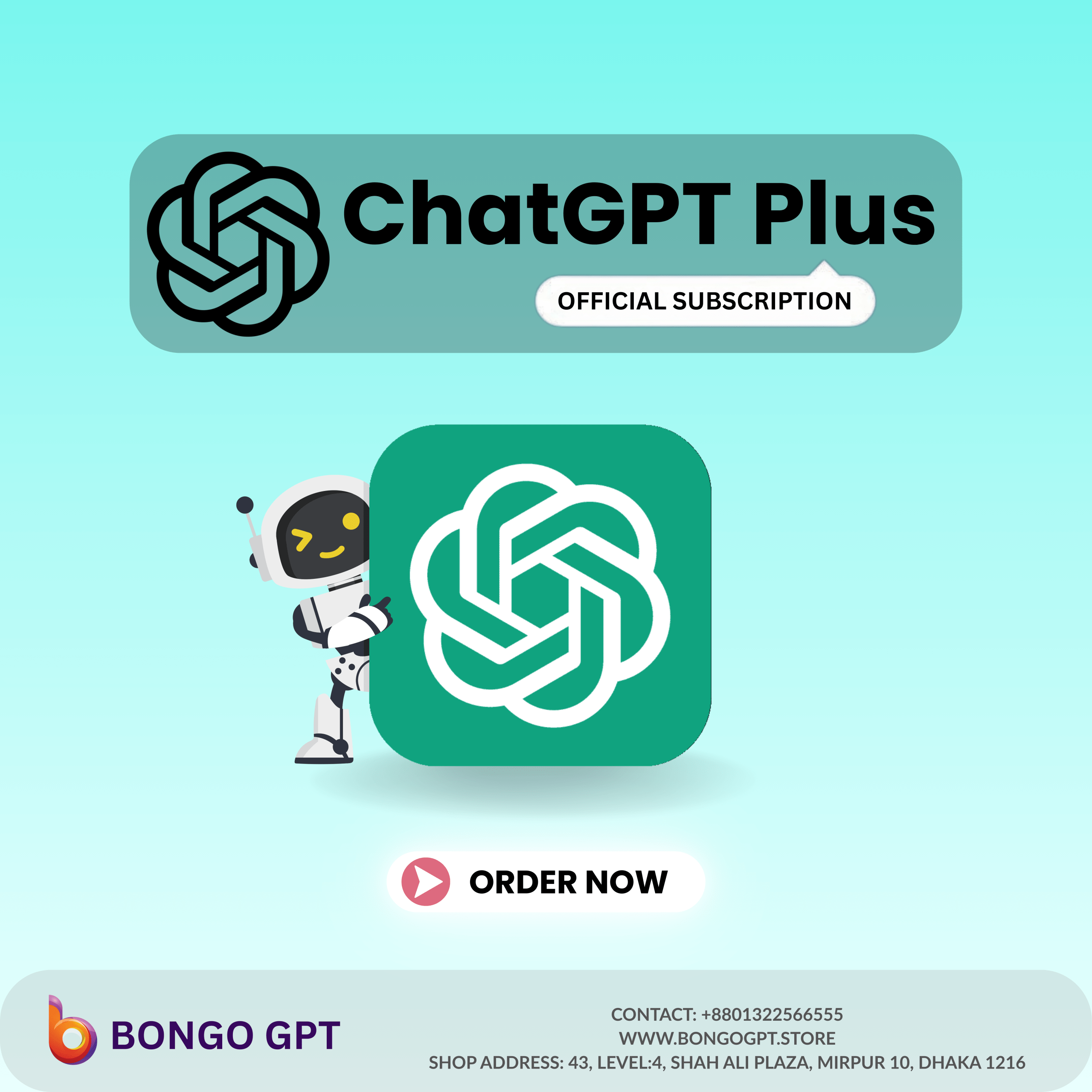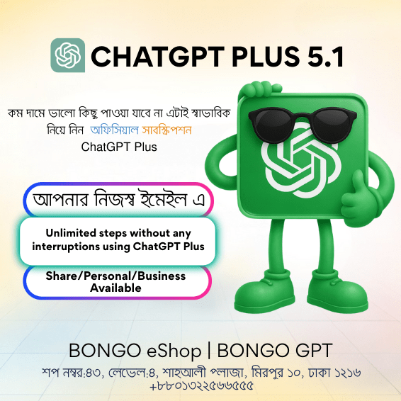 Plus মাসিক সাবস্ক্রিপশন, অটো-রিনিউ হয়। দাম/ফিচার Bongo eShop ওয়েবসাইটে দেওয়া। OpenAI